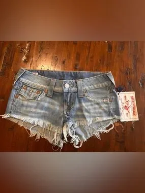 True Religion women's denim shorts. Light blue washed denim with frayed hem. Button-front closure and classic five-pocket styling. Distressed detailing for a casual look.
