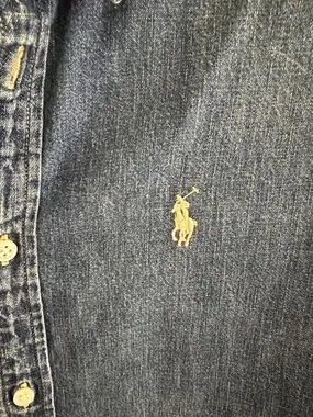 Classic denim shirt dress with full button front. Long sleeves and button-down collar. Small embroidered pony on chest. Casual and timeless piece. Excellent condition!