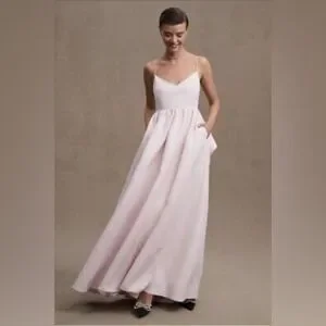This stunning pink gown by BHLDN features a sweetheart neckline with delicate spaghetti straps, perfect for a wedding or prom. The sleeveless design and flowing maxi silhouette create an elegant and timeless look.