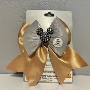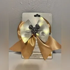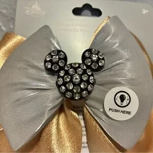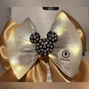 NWT, Disney Parks Mickey Mouse hair clip gold and gray bow that lights up. Iconic Mickey Mouse logo that has white sparkly stones. Retails for $16.99.