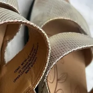 Revere Como sandals in women’s size 10M. These gold metallic two-strap sandals bring both comfort and style, perfect for everyday wear, walking, or travel. Designed with supportive cushioning and adjustable straps, they’re a practical yet stylish choice.