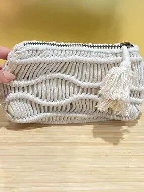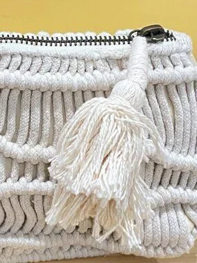 Universal Thread bag, macrame clutch, woven pouch, boho accessories, tassel zipper bag, cream makeup bag, festival clutch, coastal style, neutral aesthetic, summer essentials.