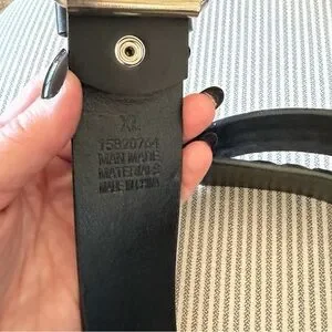 Black belt featuring multiple rows of silver pyramid studs. Polished silver-tone buckle and grommets. Edgy accessory for punk or rocker looks.
