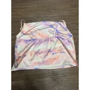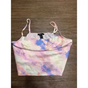 Forever 21 camisole top showcases a dreamy tie-dye pattern in pastel shades of pink, purple, blue, and yellow. Crafted from a smooth, satin-like fabric, this piece features a flattering cowl neckline and adjustable spaghetti straps for a personalized fit. The cropped silhouette and lightweight material make it an ideal choice for festival wear, summer outings, or layering under a blazer for a pop of color. A smocked elastic back ensures comfort and a secure fit throughout the day.