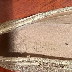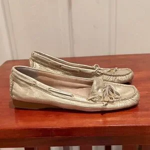Chic metallic moccasins with bow detail. Perfect for adding elegance to any look.