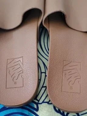 Slip-on Vans slide sandals in smooth tan. Wide single strap for easy wear. Textured footbed for grip and comfort.