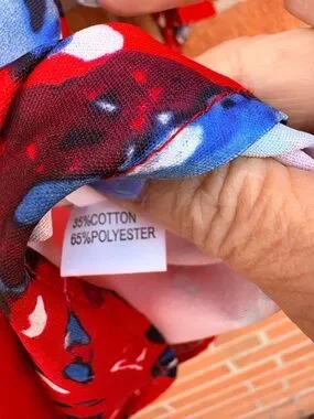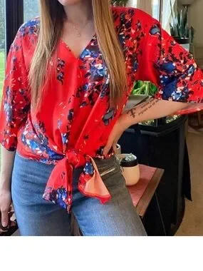 Bright red floral blouse with a flattering V-neck and front tie. Lightweight, flowy fabric for all-day comfort. Elegant blue and black floral accents add visual interest. Perfect for casual or dressed-up looks. Size small.