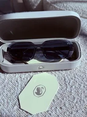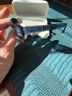 Swarovski sunglasses in blue tint. Sleek rectangular frame with subtle crystal-accented temples. Provides stylish UV protection and a modern look for everyday wear.
