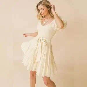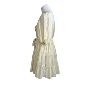 Lovecolette womens Tiered Smocked Tie waist Mini Dress Sz Large Yellow Lined
