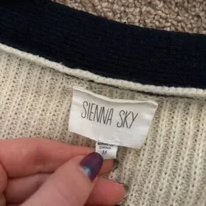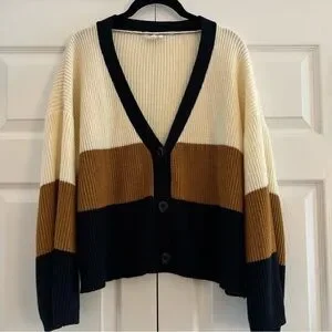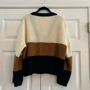 Cotton blend material. Lightweight and drapey fit. Cream, brown, and navy color blocks with thick navy trim. Three chunky navy blue buttons. Wide drape sleeves give a carefree boho feel