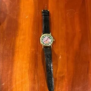 Stylish watch with a black leather strap and gold accents. Features a colorful pop art Tea Time Tea Pot art dial.