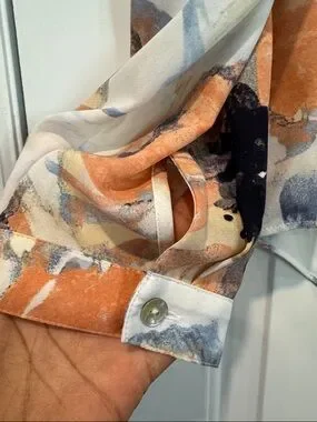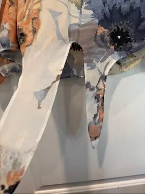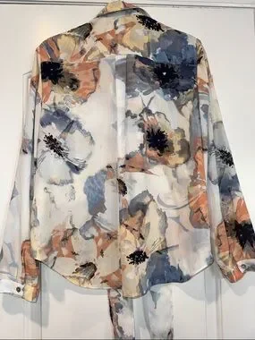 Lightweight blouse with a soft painterly floral print. Tie-front detail adds feminine shape. Airy fabric for easy layering. Excellent new condition. Perfect for spring and summer.