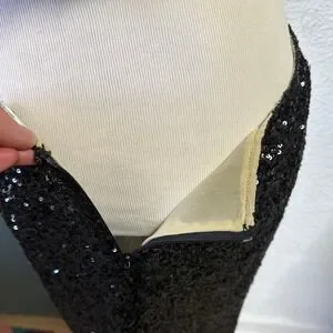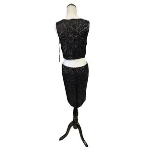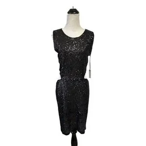 Dazzle the room in this stunning sequined midi dress, designed to catch every light as you move. This sleeveless silhouette features a daring side and back cutout that adds a modern, edgy twist to a classic cocktail look. The sleek black sequins provide a sophisticated shimmer, while the hidden back zippers on both the top and skirt sections ensure a tailored, seamless fit. This piece is in excellent pre-owned condition, ready to make a statement at your next big event. Perfect for a New Year's Eve party, a black-tie gala, or a glamorous night out on the town.