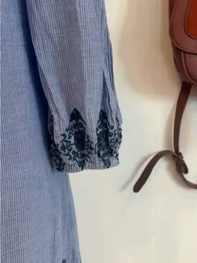 Soft blue off-shoulder dress with delicate black embroidery along hem and sleeves for a romantic, boho feel.