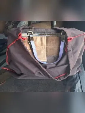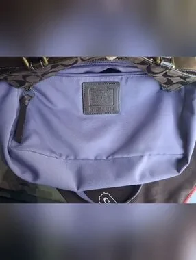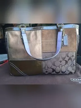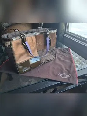 Coach tote with patchwork leather and signature jacquard panels. Lavender leather handles and trim. Polished gold-tone hardware and branded hang tag. Structured silhouette for daily use.