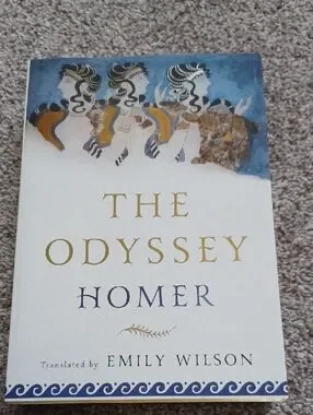 Classic edition of The Odyssey translated by Emily Wilson. Clean white, blue, and cream cover with elegant gold lettering. A refined addition to any home library or gift for literature lovers.