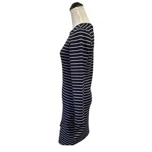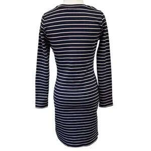 Embrace effortless sophistication with this navy and cream striped bodycon dress. This sleek silhouette features a classic crew neckline and long sleeves, perfectly balanced by a modern tulip-style wrap hem that adds a touch of contemporary flair. The soft, stretchy knit fabric ensures a comfortable, figure-hugging fit that moves with you throughout the day. This versatile piece is in new with tags condition. It is ideal for a casual office look, a weekend brunch, or a relaxed dinner date.