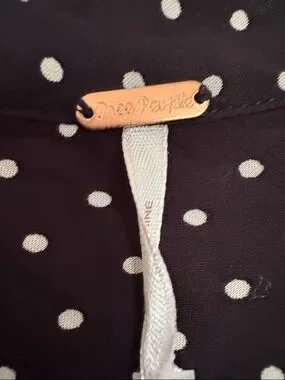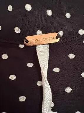 Classic black midi dress with white polka dots. Button-front closure. Slight puff sleeves and a fitted waist. Flared for movement. Feminine style.