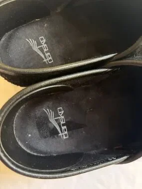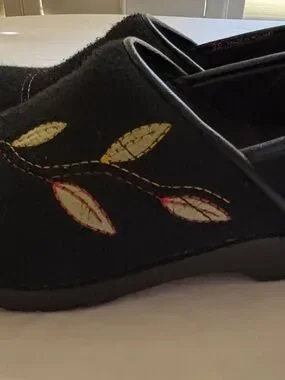 Dansko Black Wool Clogs with Yellow and Red Leaf Stitching