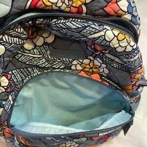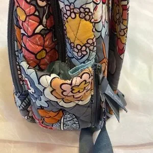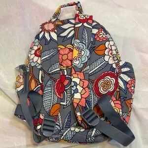 Vera Bradley quilted backpack in gray with bold floral Tropical Evening pattern. Padded straps and top handle for carrying. Front zip pocket and roomy main compartment. Colorful blooms add a vibrant look.