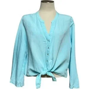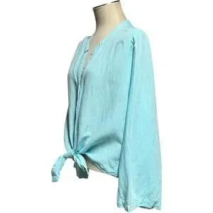 Boston Proper Linen Flare Sleeve Tie Front Button Up Top Aqua Splash Blue XL