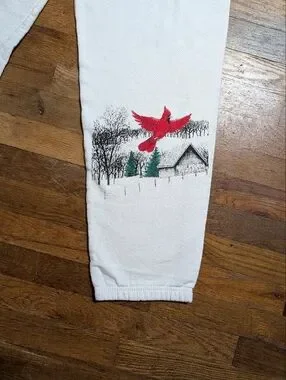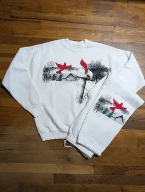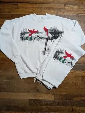 This Vintage 90's Sweatsuit Set includes a sweatshirt and joggers in size Large with a cardinal graphic design. The set is from the brand Fruit of a Loom and features a classic 90's look with red, white, and black colors. Made of a blend of cotton and polyester, this original set is perfect for those looking for retro 90's mom vibes in their clothing.