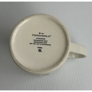 This Threshold stoneware coffee mug features a clean white finish with a bold black monogram letter B on the front. The design includes double black accent lines near the rim and base, giving it a simple and modern look suitable for everyday use. Made of durable stoneware, this mug is labeled dishwasher safe and microwave safe, though it may get hot in the microwave as noted on the base. The underside marking confirms Threshold branding along with care instructions and country of origin as China. The mug has a sturdy handle and a classic cylindrical shape, making it comfortable to hold for coffee, tea, or other hot beverages. Condition is pre-owned with no visible cracks or chips. A solid addition for personal use or as part of a monogram collection.