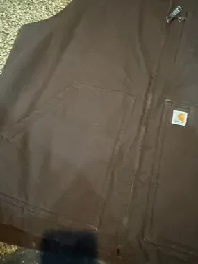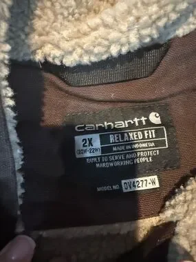 Durable sleeveless Carhartt vest with sherpa-lined collar. Full front zipper closure. Two large front hand pockets and a zip chest pocket. Sturdy duck canvas construction with logo patch at hem.