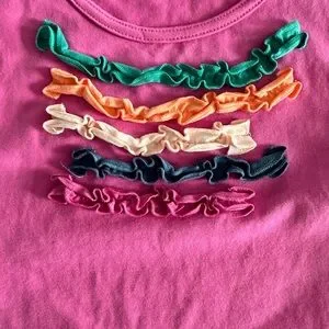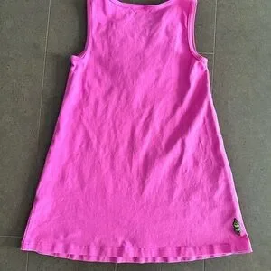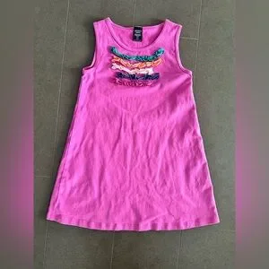 Bright pink sleeveless tank tunic top. Multicolor ruffle trim. Soft knit fabric. Simple, playful style.