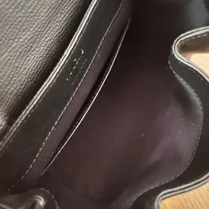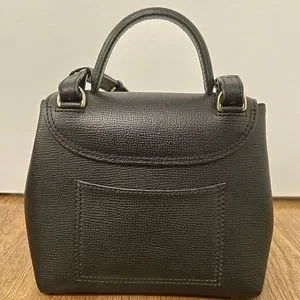 Compact, structured mini bag. Smooth pebbled leather exterior. Top handle and subtle gold logo hardware. Clean, minimalist silhouette. Versatile for day or night.
