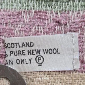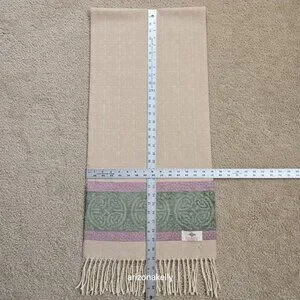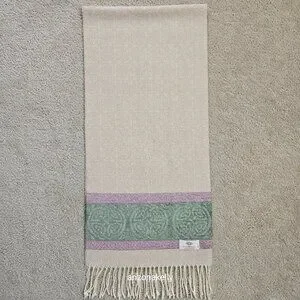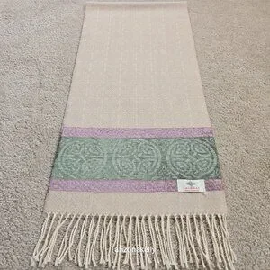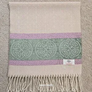 New with no flaws. Ivory colored scarf has an slightly embossed celtic design and at the ends there is a green and purple celtic knot design.