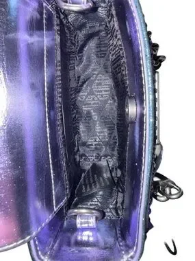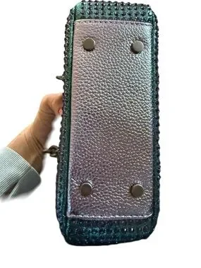 Design: A metallic top-handle bag with an iridescent finish and a logo-engraved silver-tone plate on the front.