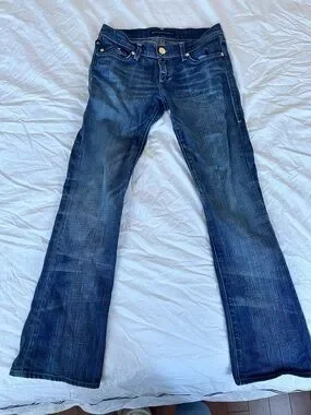 Dark indigo flared jeans with subtle whiskering. Mid-low rise with a bootcut leg. Classic five-pocket denim with metal hardware. Versatile piece for casual or dressed-up outfits.