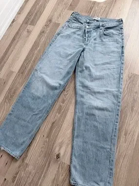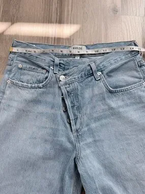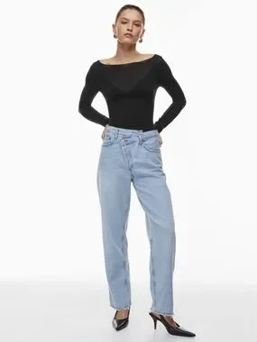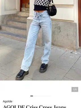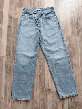 A cult favourite, these are high-rise jeans with a slouchy, oversized fit and criss-cross button fly. They’re made with lightweight, non-stretch 100% cotton denim with a subtle drape. This version comes in a classic light indigo wash with soft fading and a clean hem.