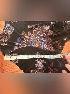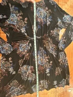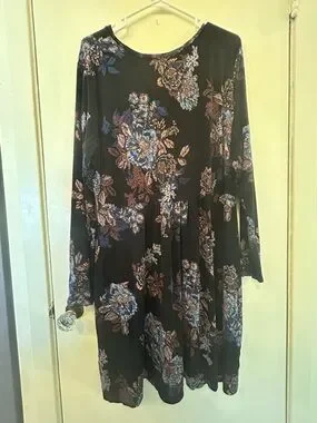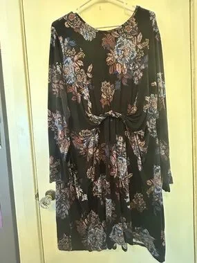 Black dress with blue and brown floral print. Long sleeves and a front knot detail. Flared skirt for easy movement. Versatile for day or evening wear. No stains or holes. Smoke free home. Ships same or next day!