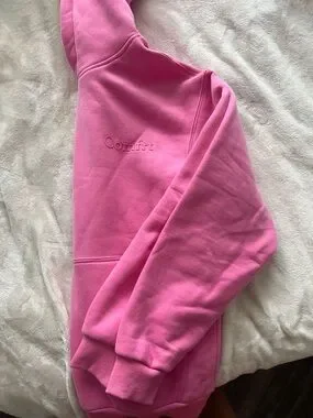 Soft crewneck sweater with an embossed "Comfort" logo for subtle branding. Vibrant pink color adds a cheerful pop to any outfit. Cozy, midweight fabric designed for everyday wear and easy layering. Simple, clean styling that pairs well with jeans or leggings.