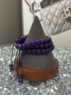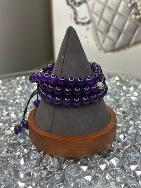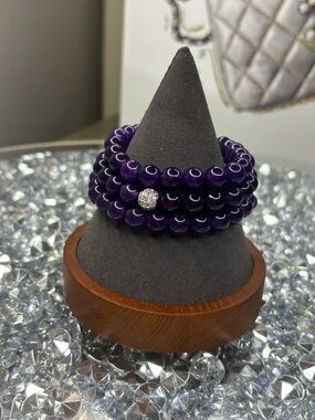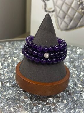 Elegant purple beaded stretch bracelet stack featuring a single pave crystal accent bead. Comfortable, flexible fit for everyday wear. Rich purple beads add a polished pop to any outfit.