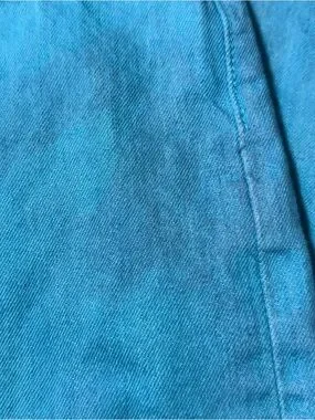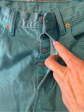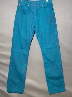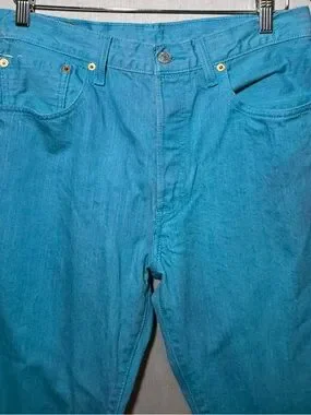 The Levi's 501 Turquoise Blue Denim Jeans are a classic men's wardrobe staple. With a button fly and straight leg fit, these jeans offer a timeless look in a solid blue color. Made from cotton denim, they feature a mid-rise and a 5-pocket design, making them both stylish and functional. The size 33X36 offers a comfortable and regular fit, while the Levi's 501 series ensures high quality and durability. Perfect for any season, these jeans can be easily machine washed for easy care. These jeans are pretty loved but in very good condition . They do have like pinkish streaks through them. Not sure if that’s how they were made notice last two pictures. I tried to show that, but it’s hard to see.
