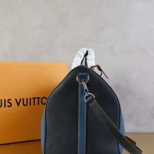 The Keepall Bandoulière 50 is a modern take on Louis Vuitton’s iconic travel duffel, reimagined in luxurious Taurillon leather. This spacious weekend bag features a rich blue Taurillon leather body, contrasted with black leather straps and natural cowhide leather accents on the handles, luggage tag, and shoulder strap. The signature LV initials are embroidered on the side, paying homage to the House’s heritage. Equipped with a detachable, adjustable shoulder strap, it can be carried by hand, worn crossbody, or slung over the shoulder, making it the perfect companion for sophisticated travel.