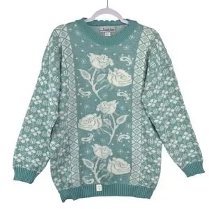 Vintage Private Eyes knit sweater in a stunning teal and white floral jacquard pattern. This cozy piece features a delicate rose motif centered between geometric borders, accented with a subtle silver Lurex shimmer throughout for a touch of holiday magic. The relaxed, oversized fit and ribbed crew neck make it a perfect choice for layering during the colder months. This item is in excellent vintage condition with no visible flaws. Suitable for a festive holiday gathering, a casual winter coffee date, or a cozy weekend getaway.