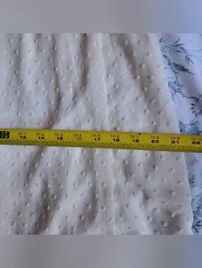 Lightweight ivory midi or maxi with textured Swiss dot fabric. V-neckline and elasticated waist for shape. Sheer three-quarter sleeves with delicate lace trim. Flowing skirt for an elegant silhouette. Lined for comfort and modesty. Pullover style.