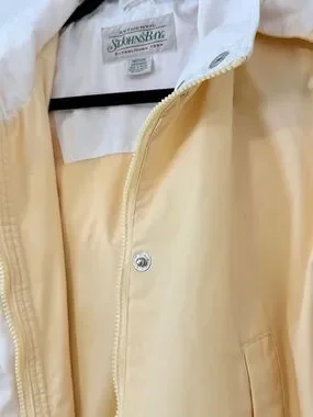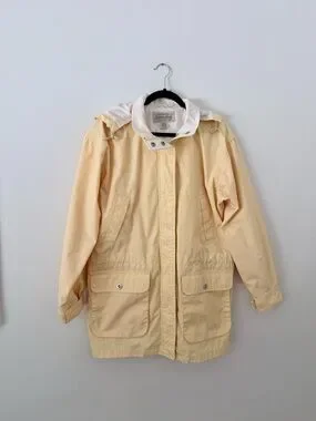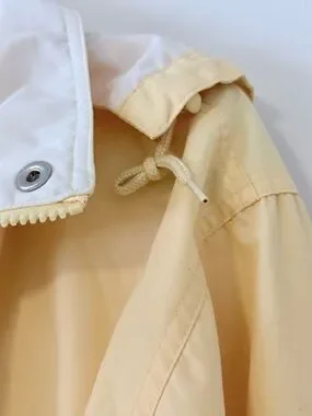 This is the most beautiful light, pastel, yellow hooded anorak jacket with a snap and zip front closure. Women’s size Medium (slightly oversized), Vintage St. John’s Bay jacket from the 1990’s in immaculate condition! Two front flap pockets and side welt pockets. White contrast hood lining. Perfect jacket for spring- it’s a cotton polyester blend with a nylon lining. It’s water resistant, and lightweight. It features drawstrings to cinch in the waist and hood to create a flattering fit.