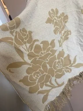 Soft fringe wrap with a large floral pattern. Reversible look with contrasting floral panels. Lightweight and cozy layering piece. Easy to style over outfits.