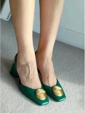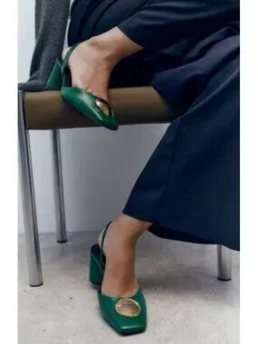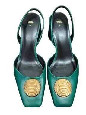 ZARA leather heels, green leather slingback heels, gold medallion shoes, square toe leather heels, block heel sandals women, Zara leather shoes size 10, statement heels green, modern luxury style shoes