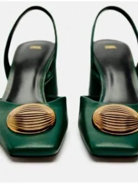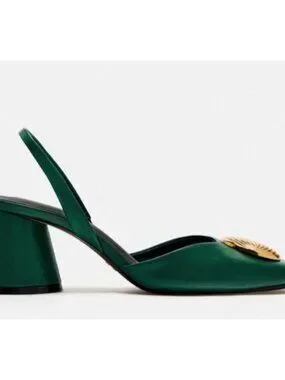 Chic ZARA slingback heels crafted from genuine leather in a rich emerald green tone, featuring a bold sculptural gold medallion detail.