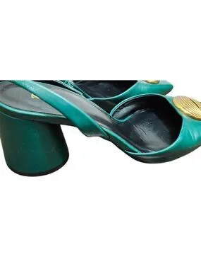 ZARA Green Leather Slingback Heels Gold Medallion Block Heel Women’s EU 41 US 10
