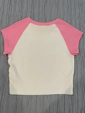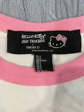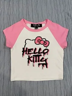 Playful Hello Kitty tight fit tee with pink raglan sleeves. White body showcases bold dripping logo and bow with rhinestone detailing. Lightweight cotton. Never worn.
