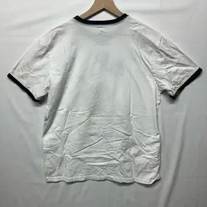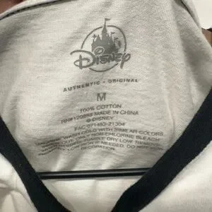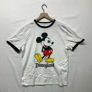 Authentic Disney Disneyland Mickey Mouse ringer t-shirt featuring a classic Mickey graphic with Disneyland text. White body with black contrast collar and sleeve trim. Made from 100% cotton with a comfortable regular fit. Great for Disney fans, park wear, casual outfits, or collectors.