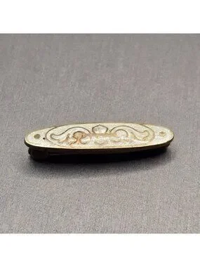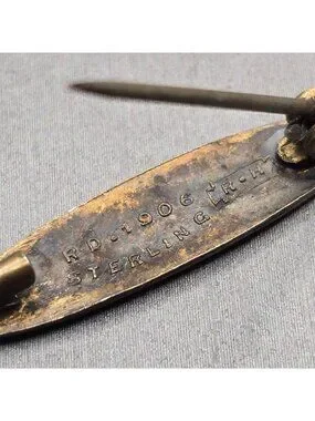 Antique 1906 sterling silver lingerie pin featuring ornate Art Nouveau scrollwork and a boxed RH maker’s mark. This registered design piece shows beautiful early 20th‑century craftsmanship with elegant symmetry and hand‑worked detail. A small area of natural yellowing is present on the front, common in pieces of this age. A rare and collectible sterling accessory from the Edwardian era.