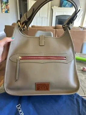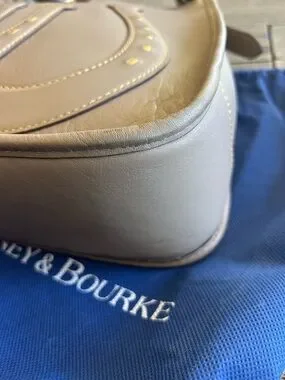 Dooney & Bourke shoulder bag in taupe leather. Embossed horseshoe detailing on front. Gold-tone hardware accent. Top tab closure and adjustable strap. Sleek, structured silhouette for everyday wear.